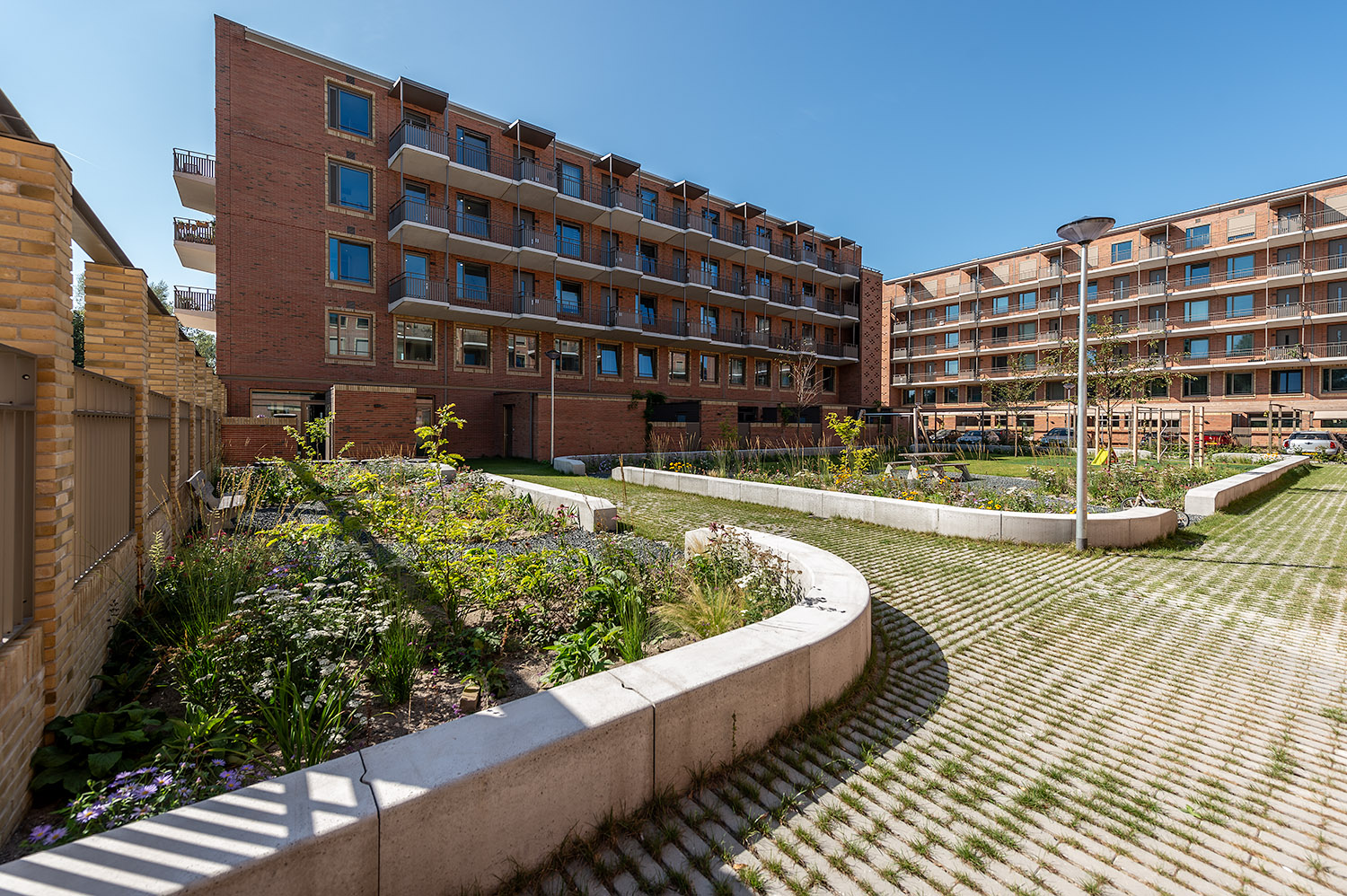 Elementen uit de oudbouw komen terug in het nieuwe ontwerp, zoals metselwerk en flauwe kappen. In de oudbouw bestond de begane grond uit bergingen. In de nieuwbouw komen daar grondgebonden eengezinswoningen, waardoor de buurt een levendiger karakter krijgt.